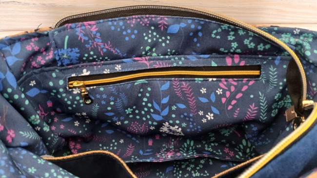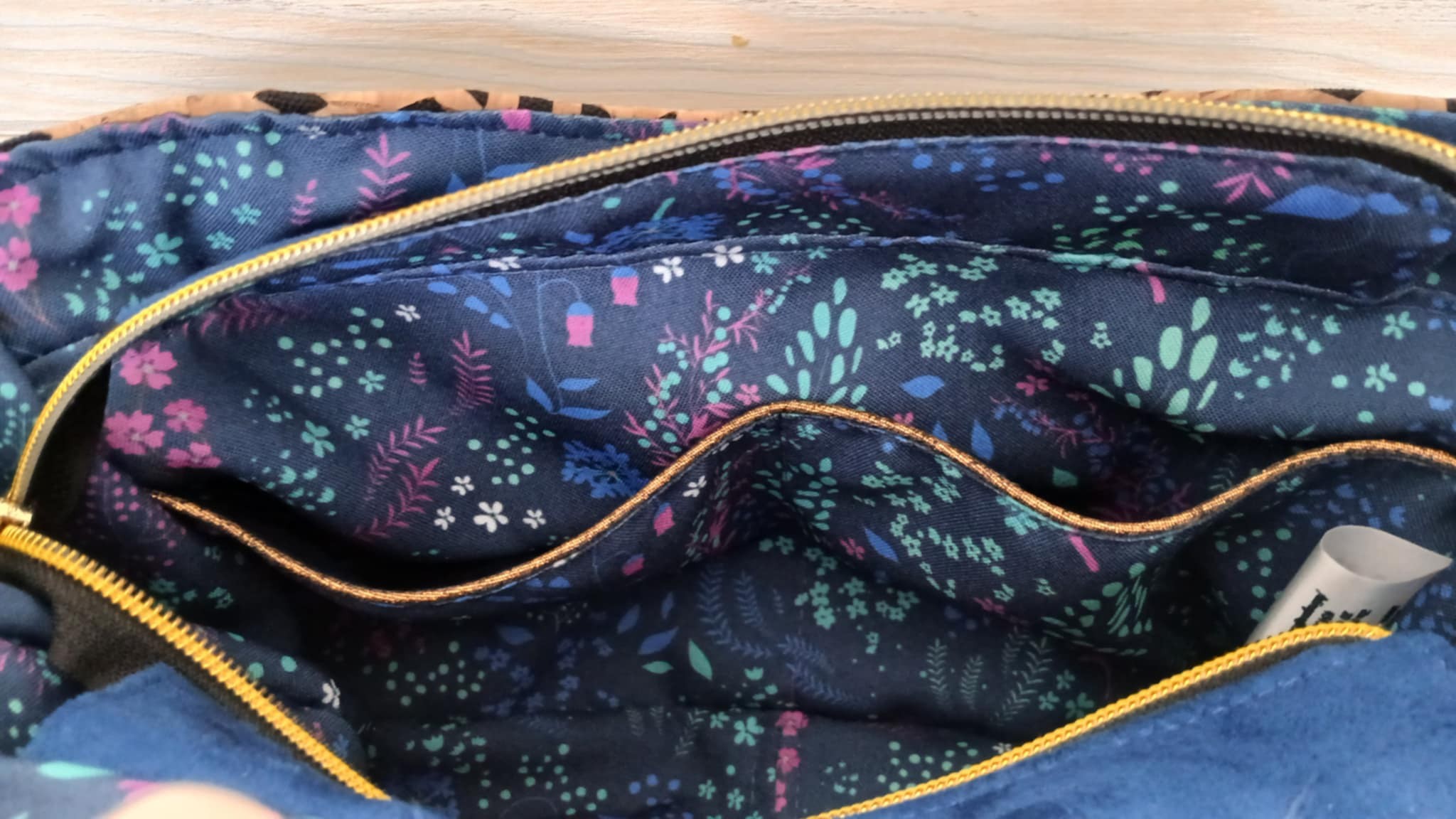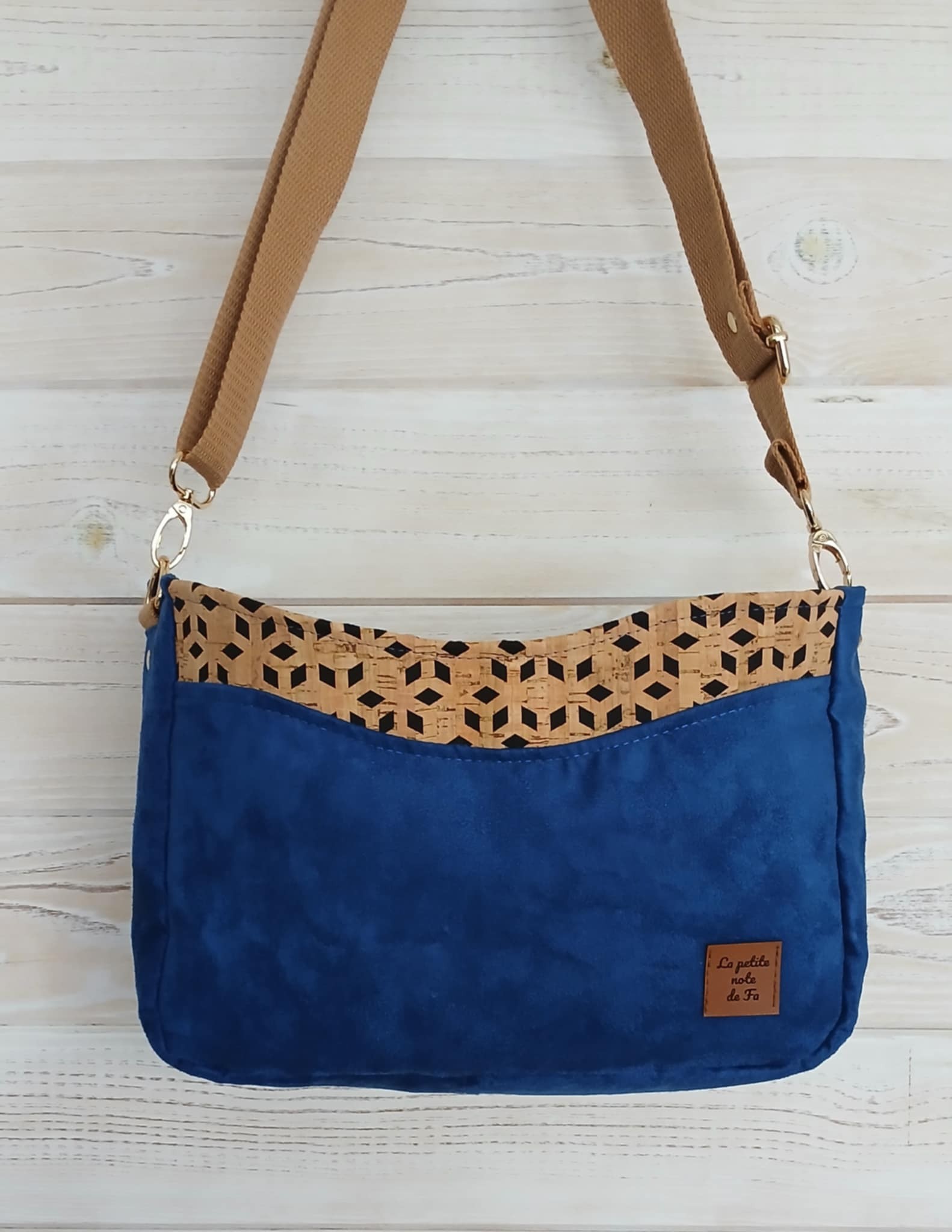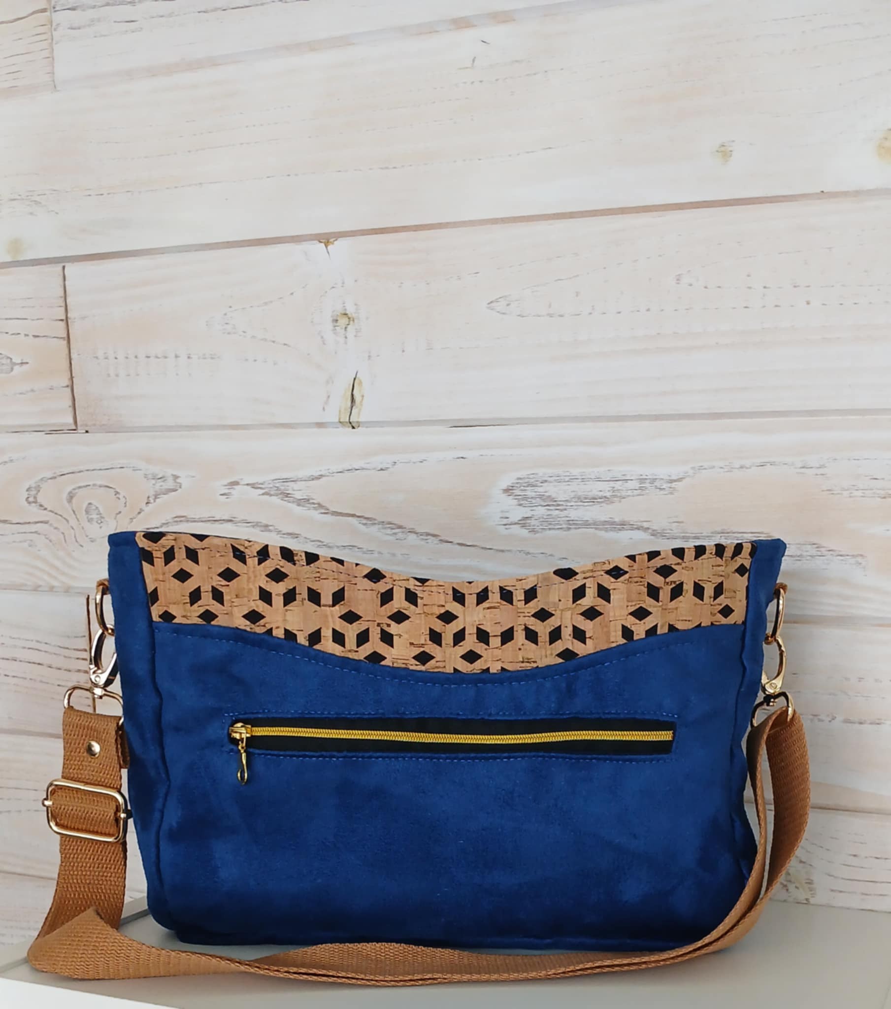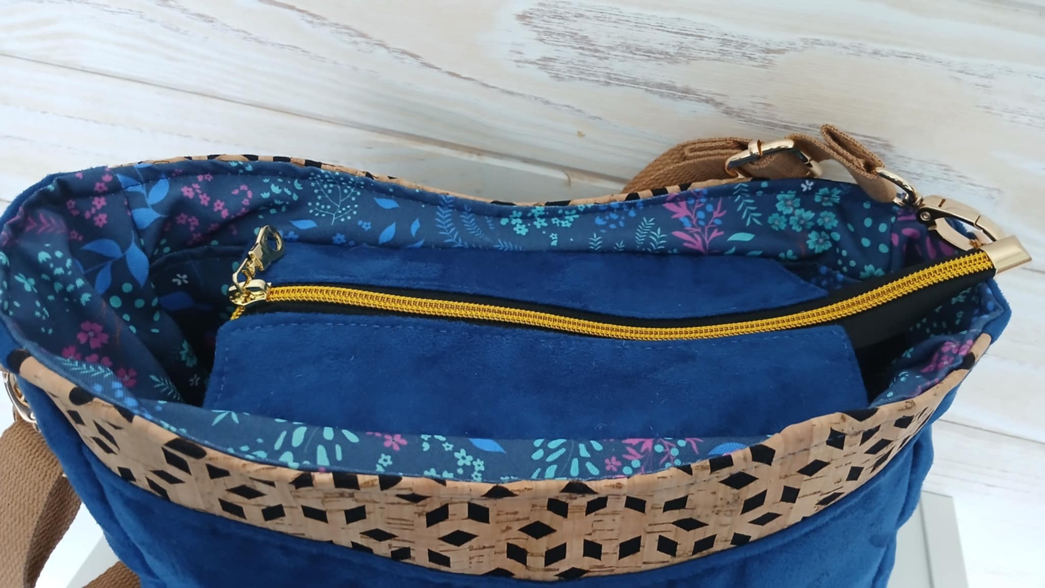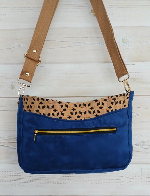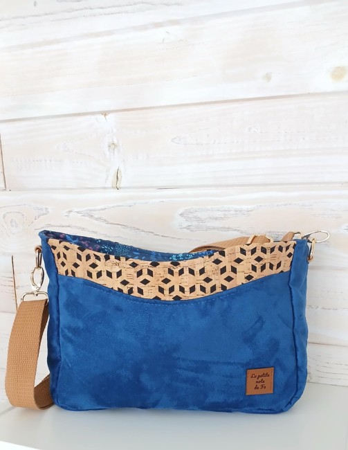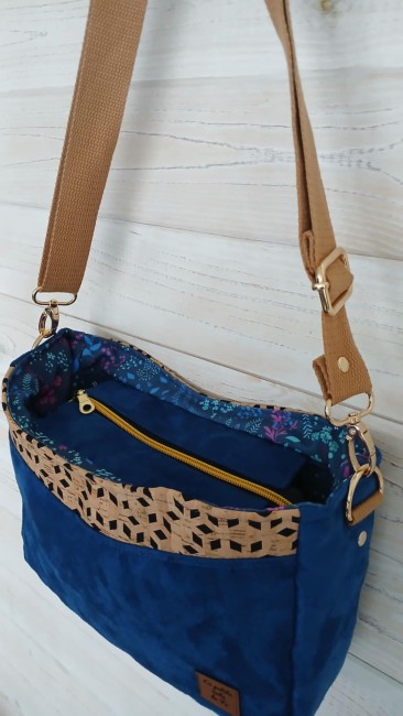 Confectionné en suédine Alaska bleu roi, douce au toucher et résistante et tissu liège monté sur jeans losange sur fond noir, il est sublimé par une doublure en coton imprimé fleurs champêtres aux nuances violettes, bleues et vertes, sur fond bleu nuit.