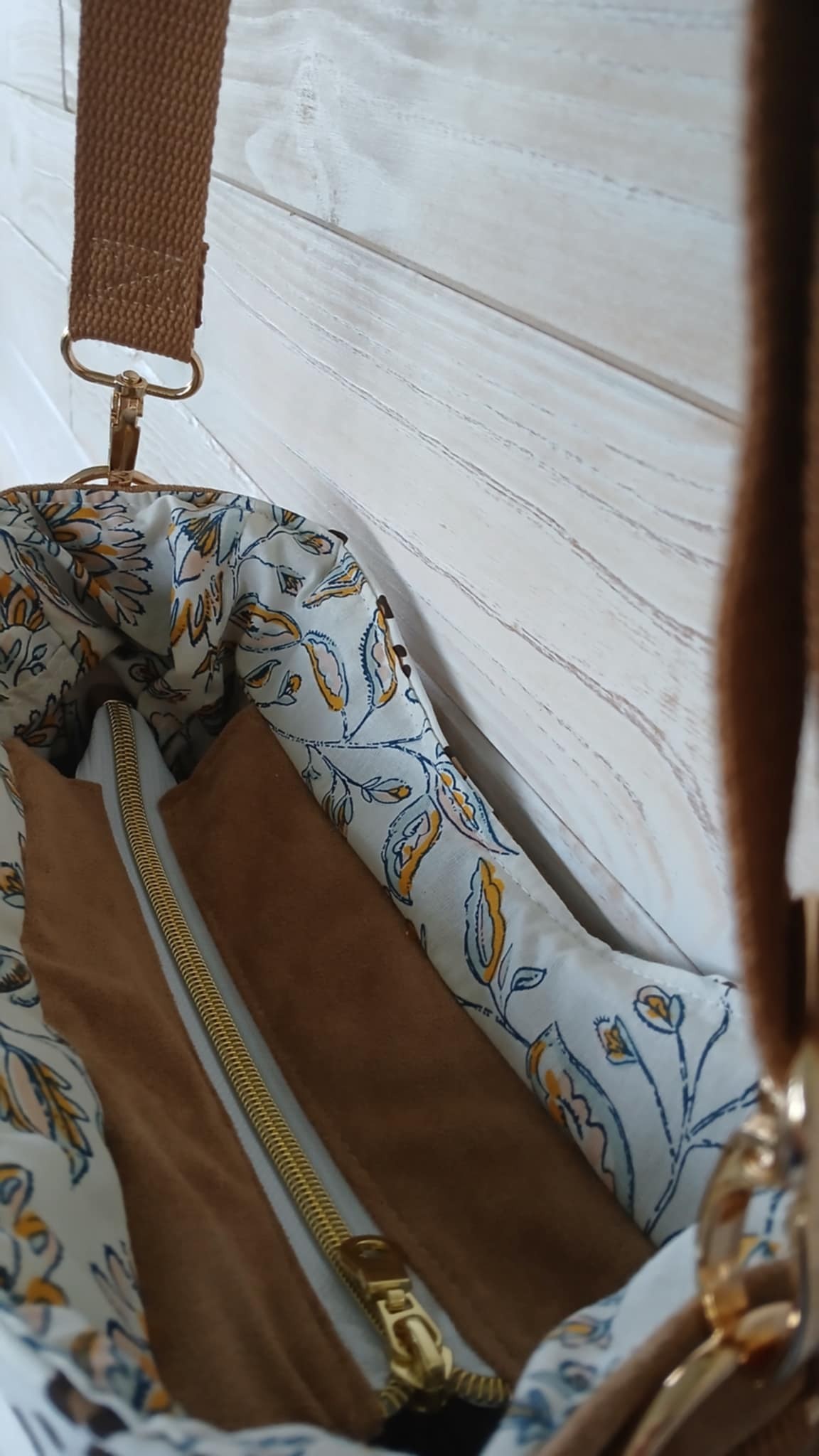 đ Sac Nina Fauve – Suédine camel, empiècement léopard & doublure fleurie – Fait main