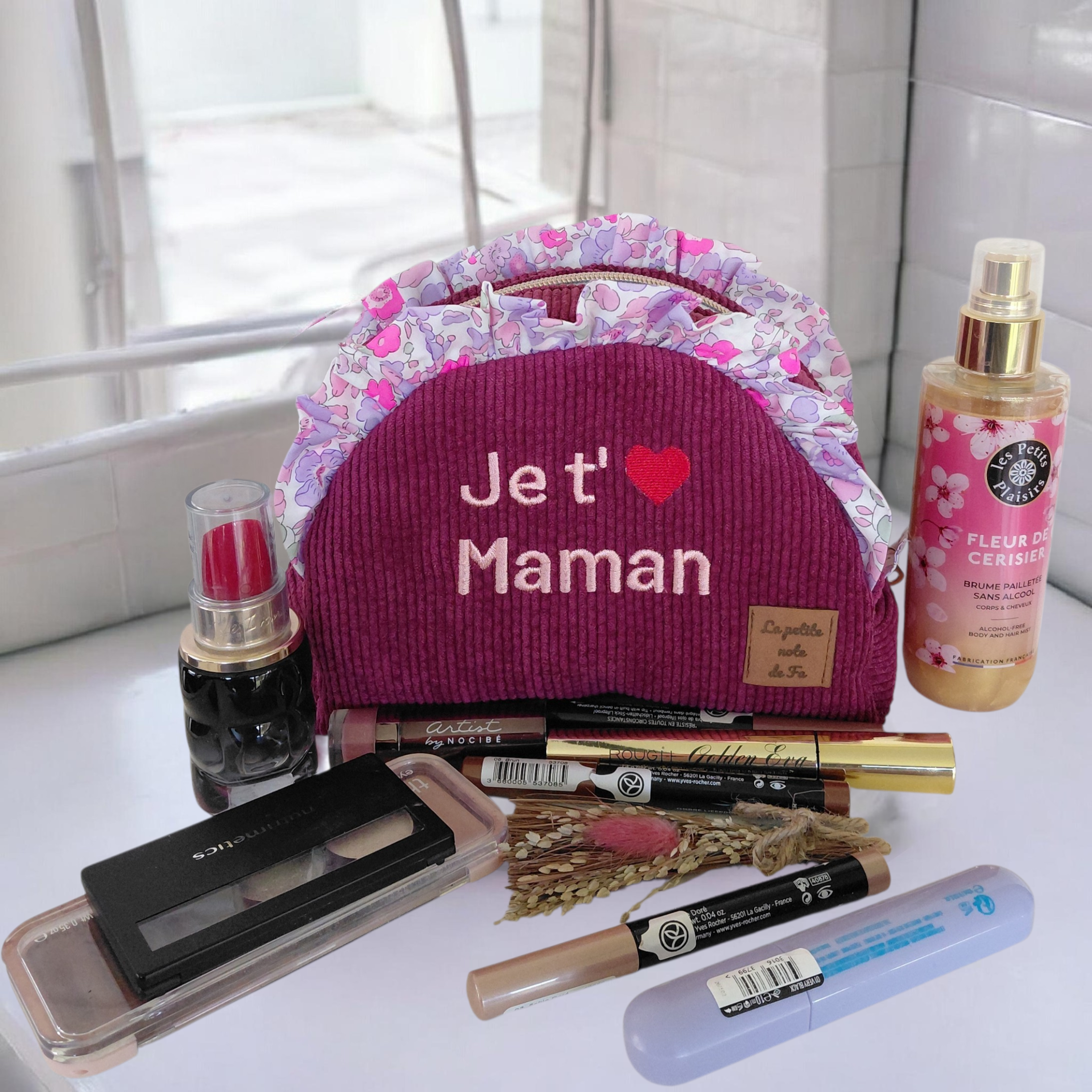 Craquez pour la trousse demi-lune prune brodée “Je t’aime maman”, une version élégante et prête à l’envoi.